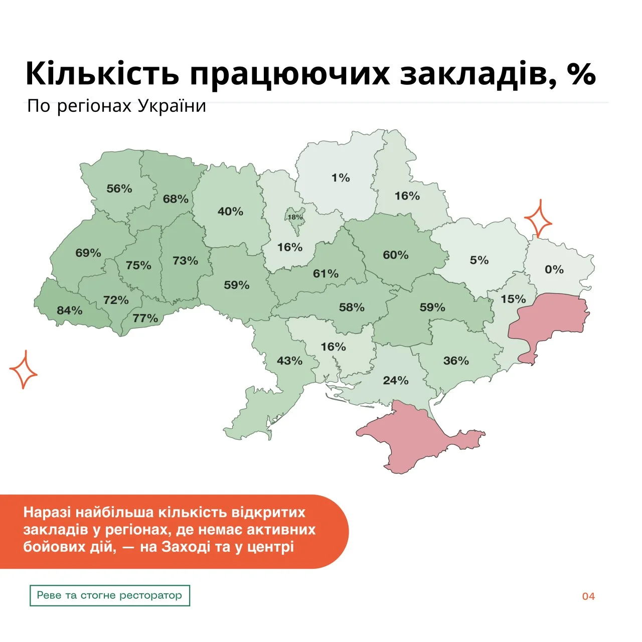 Наибольшее количество открытых заведений — в регионах, где нет активных боевых действий. Так, в Закарпатской области сегодня работают 84% заведений, в Черновицкой — 77%, в Тернопольской — 73%, в Хмельницкой — 75%, в Ивано-Франковской — 72%, во Львовской — 69% от довоенного количества.
