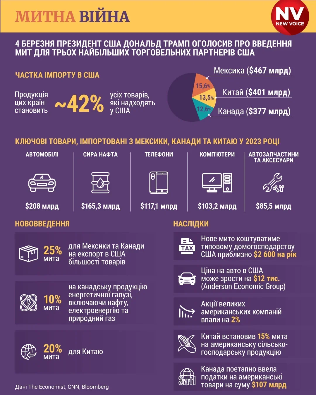 1 февраля Дональд Трамп объявил, что вводит 25% пошлину на импорт из Канады и Мексики, а также 10% - на товары из Китая. Впоследствии этот шаг был отложен на 30 дней — до 4 марта.