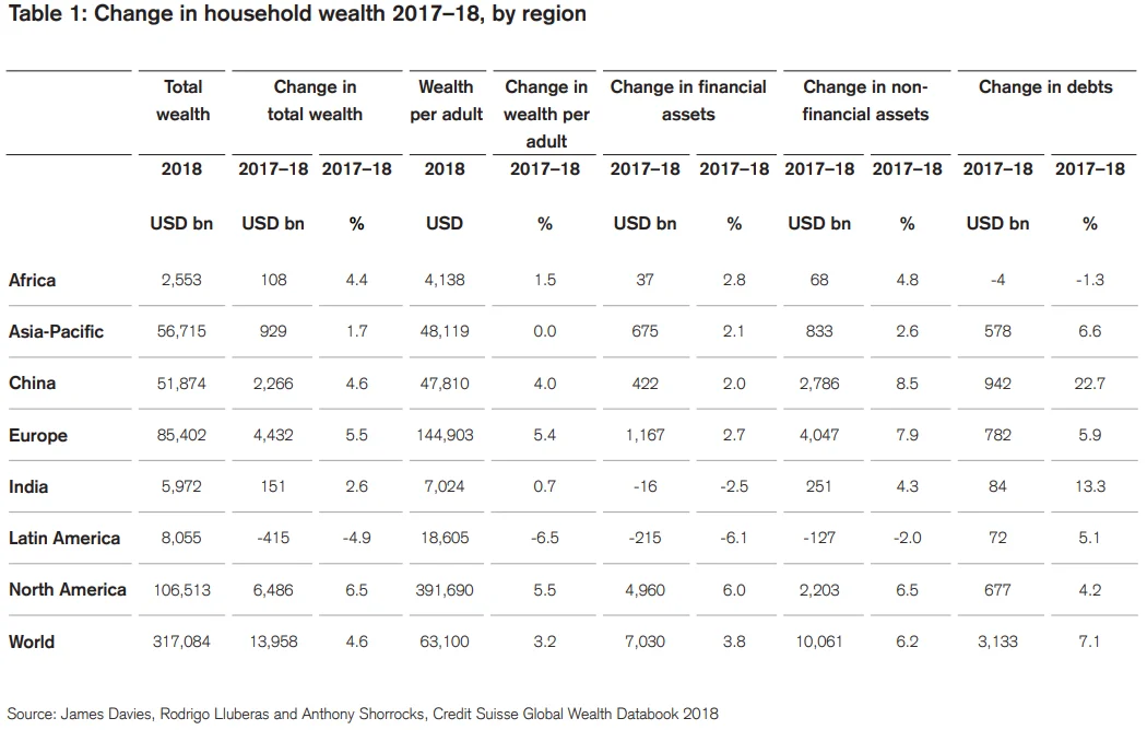 США внесли наиболее значительный вклад в рост мирового благосостояния. За минувший год показатель стоимости активов американцев вырос на $6,3 трлн, до $98 трлн, продолжив демонстрировать непрерывный подъем показателей совокупного благосостояния и благосостояния на взрослую душу населения с 2008 года.