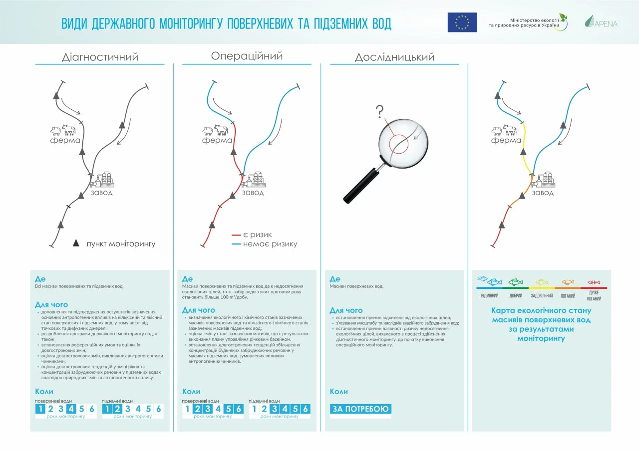 - Мониторинг соответствует бассейновому принципу управления реками – то есть оценка состояния проводится для всего бассейна, а не по участку реки в пределах административного деления. На законодательном уровне интегрированное управление водными ресурсами по бассейновому принципу введено еще в 2016 году и сейчас ведется работа над созданием Бассейновых советов (органами управления речных бассейнов) и Планами управления бассейнами рек (реферат и Конституция для надлежащего менеджмента рек).