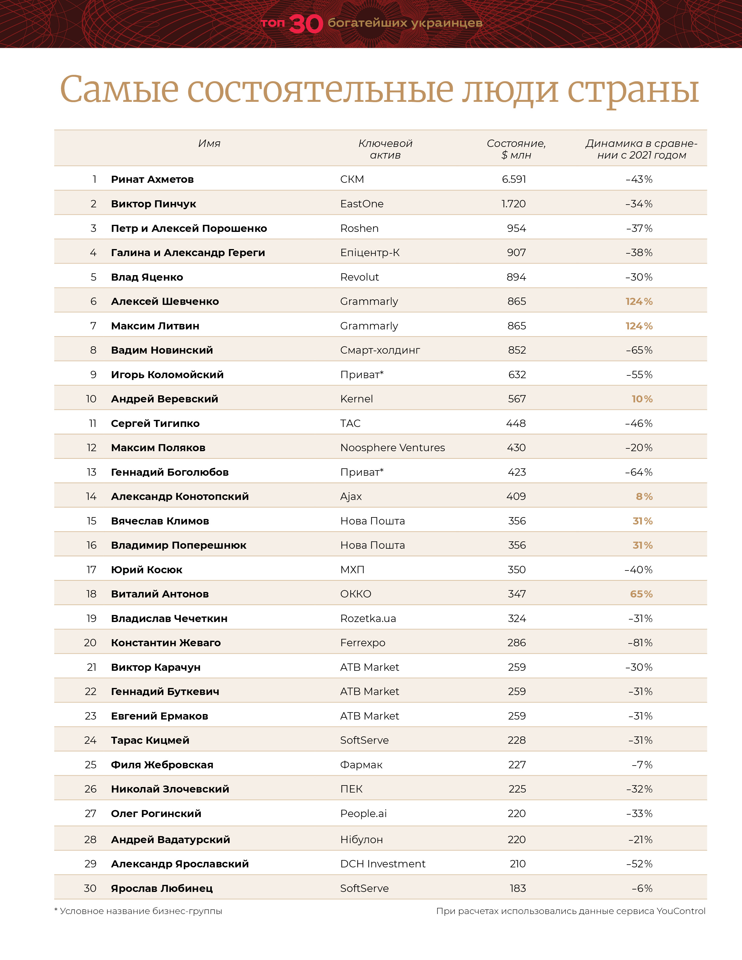 Итак, за время полномасштабного вторжения активы первого из списка самых богатых — Рината Ахметова сократились с $11,5 млрд до $6,6 млрд. Учитывая масштаб нанесенного ущерба, это еще не такое уж большое обесценивание состояния № 1 в Топ-30.