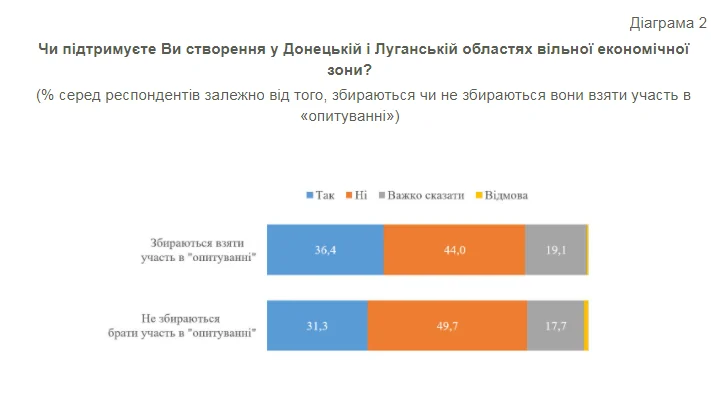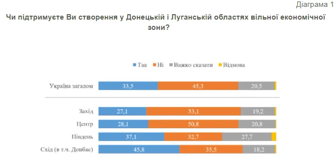 45% українців не підтримують створення вільної економічної зони (ВЕЗ) на підконтрольних Україні територіях Донецької та Луганської областей. За — 33,5%.