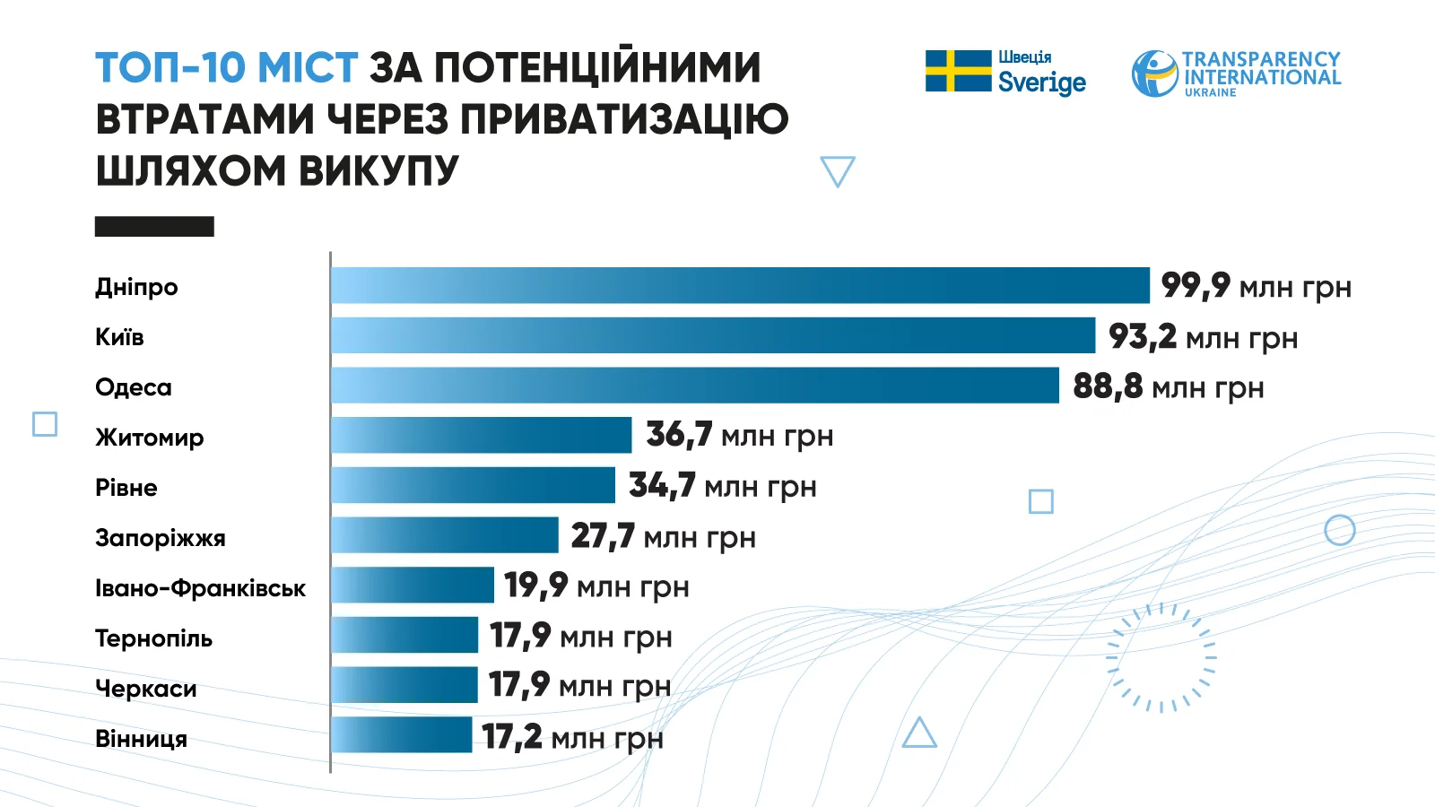 «У середньому у містах, де застосовували обидва механізми, вартість об'єктів, придбаних на конкурентних засадах, перевищувала ціну продажу об'єктів, приватизованих шляхом викупу, на 45%», — йдеться в дослідженні. — «Відповідно бюджети міст, які застосовували механізм викупу, за майже 6 років могли втратити загалом приблизно 552 млн грн».