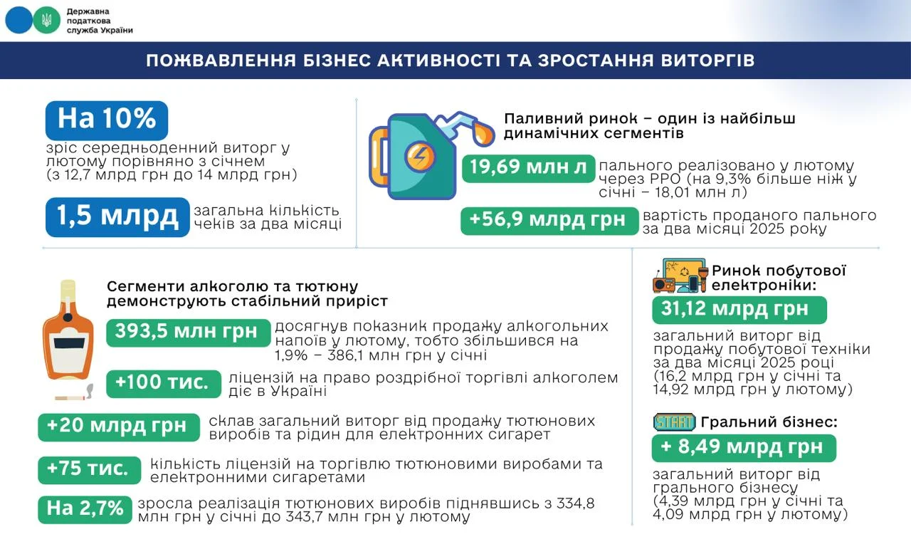 Середньоденний виторг у лютому зріс на 10% порівняно з січнем — з 12,7 млрд грн до 14 млрд грн. Загальна кількість чеків за два місяці склала 1,53 млрд, що свідчить про зростання купівельної активності, повідомляє Державна податкова служба.