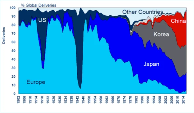 Взагалі ж за останні сто з гаком років ситуація кардинально змінилася (див. файл 4). Якщо на початку ХХ століття Європа займала більше 80% світового ринку, то зараз її частка скоротилася до лічених відсотків. Якщо США до середини 40-х рр. будували близько 90% світового дедвейту, то тепер частка цієї країни ледь проглядається, навіть, незважаючи на державний протекціонізм.