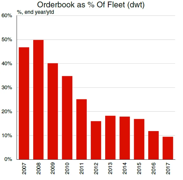 Тенденції останніх років свідчать про падіння глобальних обсягів суднобудування. Так в 2015 р. воно завалилося відразу на 40%, перш за все серійне (на цьому тлі й зросла частка Європи), а інвестиції в новобудови впали з $ 113 млрд до $ 69 млрд. Замовлення на балкери взагалі впали на 68%. За підсумками 2015 р. три найбільші верфі Південної Кореї – Hyundai, Daewoo і Samsung отримали сумарний збиток в $ 6,41 млрд. А світовий портфель замовлень у відсотках до дедвейту наявного торгового флоту скоротився з 50% у 2008 році до неповних 10% в 2017-му (див. файл 5). Аналітики поки що не бачать тенденцій до різкого зростання світового суднобудування.