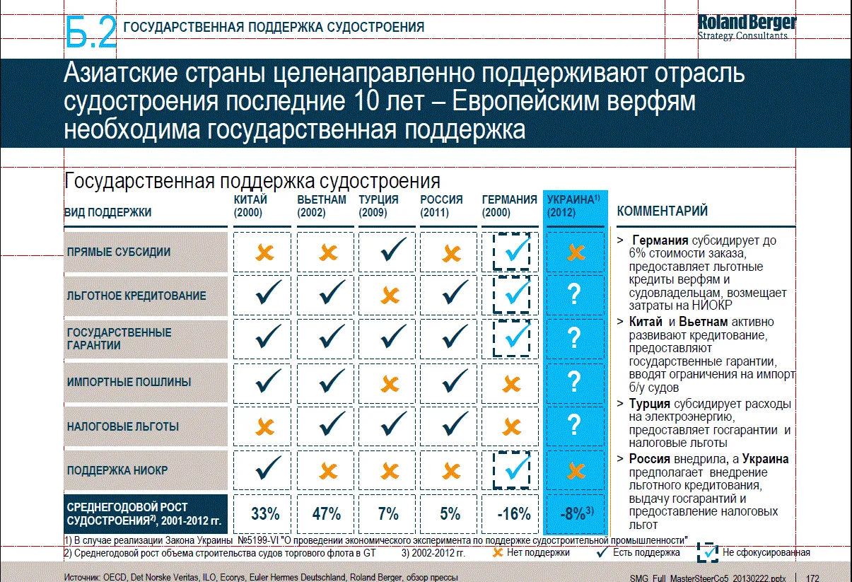 Консалтингова компанія Roland Berger, яка належить до міжнародних лідерів у своїй галузі, вивчила досвід державної підтримки суднобудування в усьому світі. Виявилося, що Китай, В'єтнам, Росія і Німеччина пропонують пільгове кредитування, причому в ряді випадків не тільки верфям, але і їх замовникам; В'єтнам, Туреччина і Росія – податкові пільги; Китай і Німеччина фінансово підтримують галузеві науково-дослідні і дослідно-конструкторські роботи; ряд країн скасували або звели до мінімуму ввізні мита на комплектувальне обладнання та матеріали, що використовуються при будівництві суден. А Туреччина пішла ще далі – держбюджет субсидує видатки на електроенергію для верфей. І, що найголовніше, всі без винятку країни, які розглядалися в дослідженні, надають замовникам держгарантії (див. файл 1).