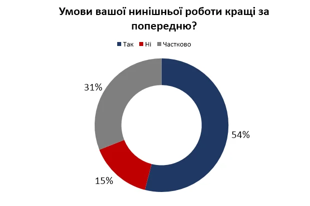 Серед тих, хто змінив роботу, 54% заявляють про поліпшення умов праці. 31% респондентів вдалося частково поліпшити умови порівняно з попереднім місцем роботи. Однак, для 15% респондентів зміна компаній не посприяла покращенню умов роботи.