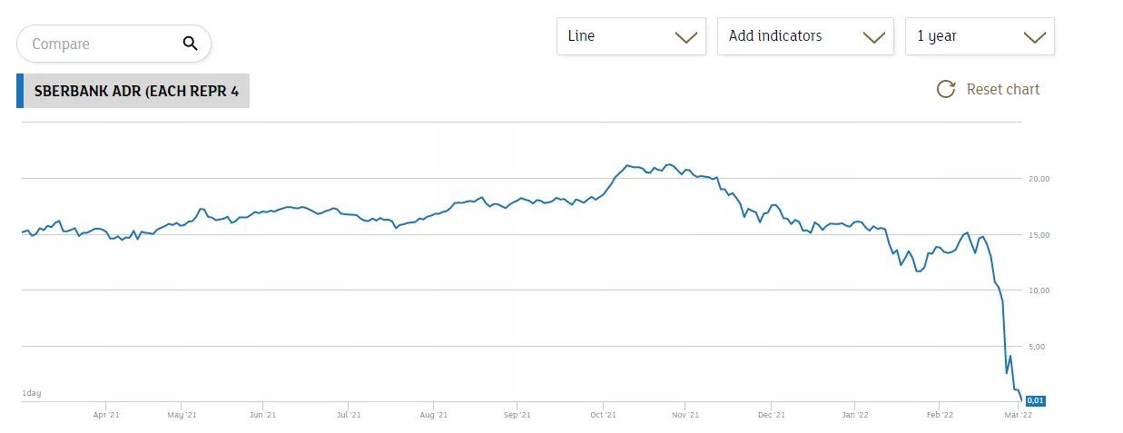 У середу, 2 березня, депозитарні розписки російського Сбербанку на Лондонській біржі знизилися до $0,01.