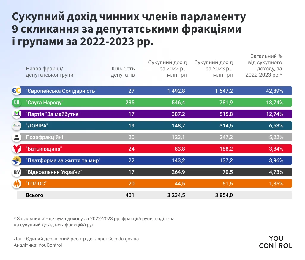 Фахівці YouControl вивчили дані Єдиного державного реєстру декларацій. А саме: 11 розділ декларацій Доходи, у тому числі подарунки. Було виявлено 391 декларацію чинного народного депутата за 2022−2023 роки. Нині ж у Верховній Раді налічується 401 народний депутат 9 скликання. Сукупний дохід чинних нардепів, декларації яких є у відкритому доступі за 2022−2023 рр., склав більше 7 млрд грн. Так, 42% від суми складають доходи депутатів Європейської Солідарності, 18% — Слуги Народу, 12% — Партії За майбутнє, 6% — Довіри, 5% — доходи позафракційних нардепів. Доходи інших політсил складають трохи більше ніж 10% від загальної суми.