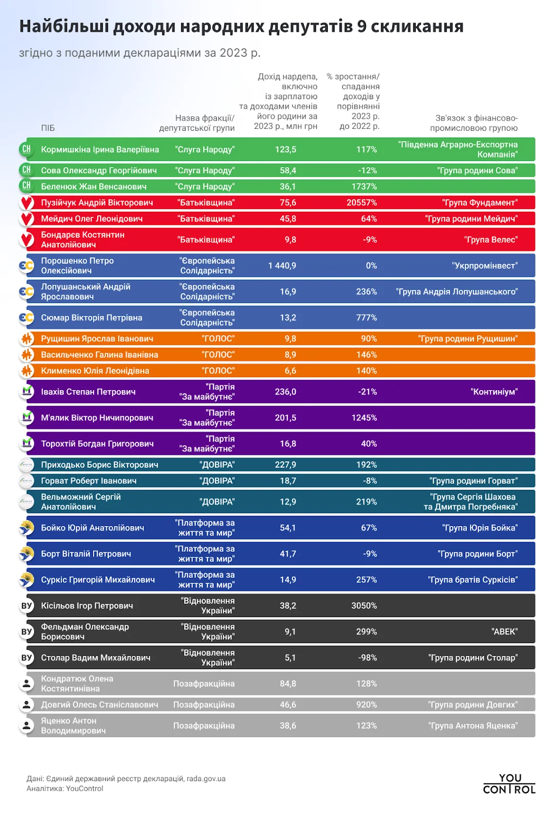 До слова, доходи фракції, лідером якої є Петро Порошенко, складають понад 42% від усієї суми доходів чинних нардепів. Андрій Лопушанський з ФПГ Група Андрія Лопушанського у 2023 році задекларував майже 17 млн грн доходу. Основна частина припадає на дохід його дружини Тетяни від відчуження нерухомого майна на майже 11 млн грн та дохід від підприємницької діяльності у 4,9 млн грн. Дохід Вікторії Сюмар за 2023 рік — понад 13 млн грн, 10 млн грн з якого отримав її чоловік Віктор Христюк за відчуження нерухомого майна. Пані Сюмар є лідеркою за зростанням доходу у 2023 році порівняно з 2022-м.