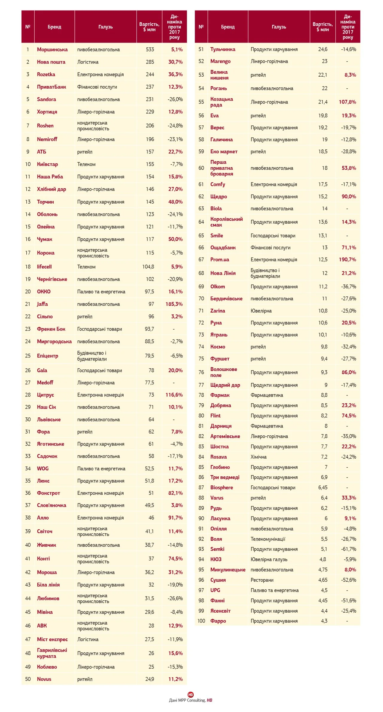 Журнал Новое Время спільно з MPP Consulting представляють топ-100 найдорожчих національних торгових марок. Сумарна вартість цієї сотні – майже $6 млрд.