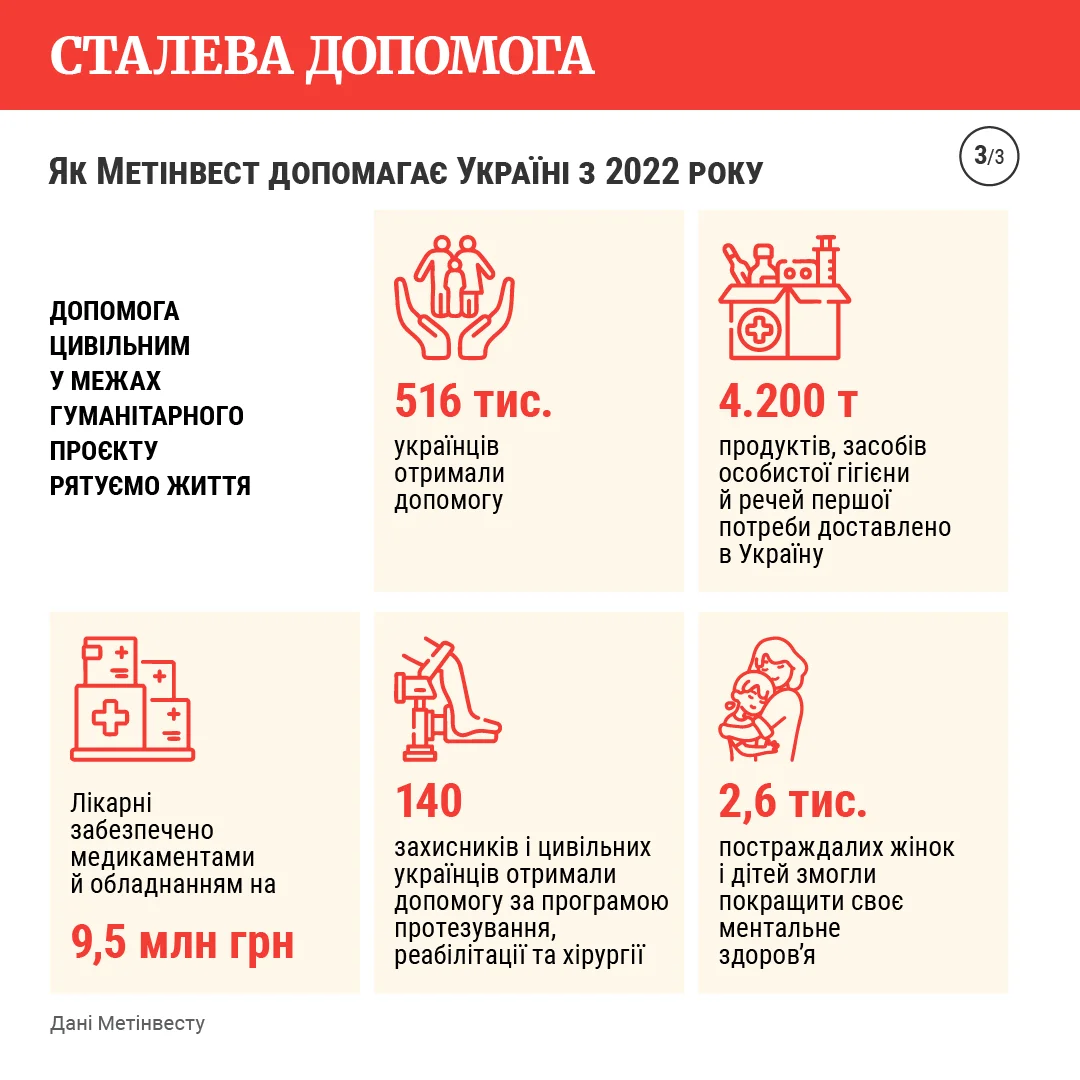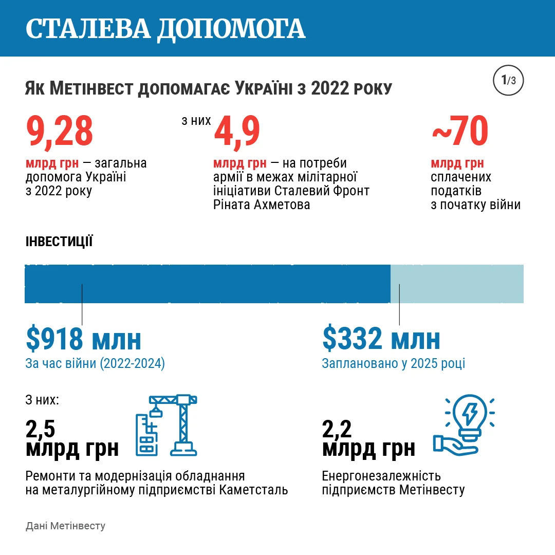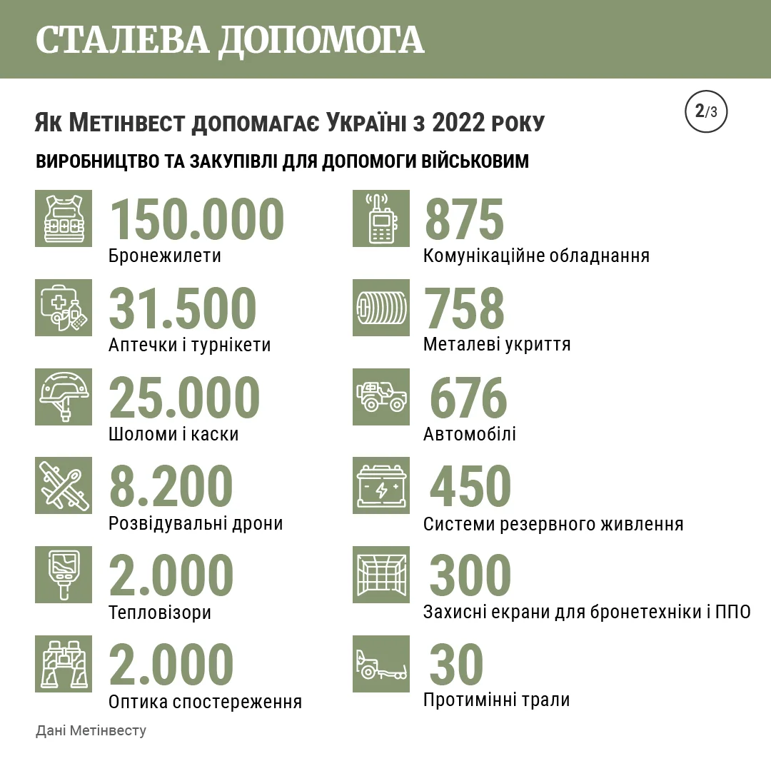 У 2022−2025 роках компанія направила понад 10 млрд грн на гуманітарну підтримку держави, громадян і допомогу ЗСУ та іншим підрозділам, що боронять Україну. З них близько 5 млрд грн надано на потреби армії в межах мілітарної ініціативи Сталевий Фронт Ріната Ахметова.
