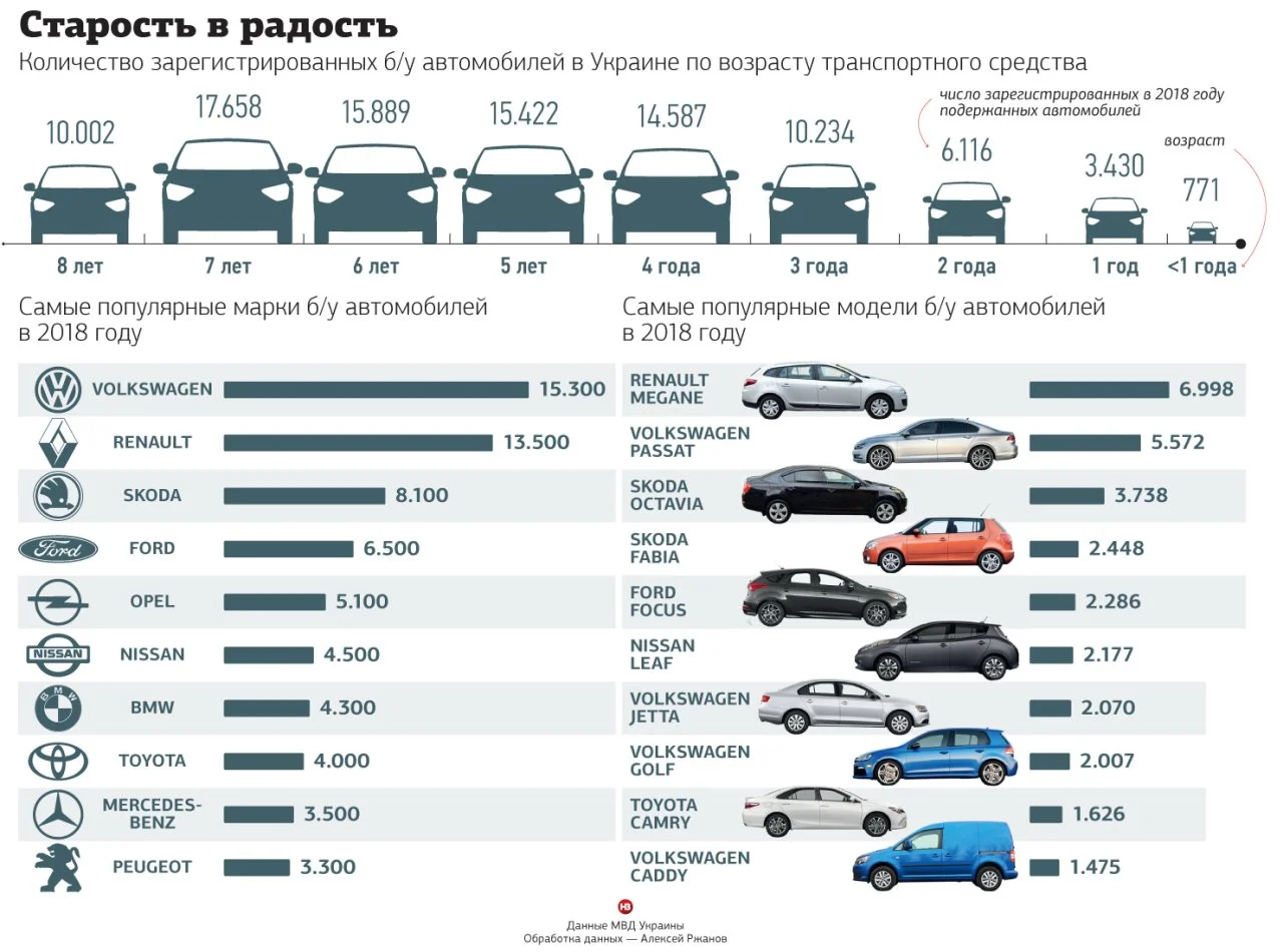 Якщо дивитися на ринок глобально, то найпопулярніший серед офіційно куплених українцями автомобілів, за даними статистики, виглядає так: це п'яти-семирічний седан Renault Megane, Volkswagen Passat і Škoda Octavia вартістю $9-12 тис.