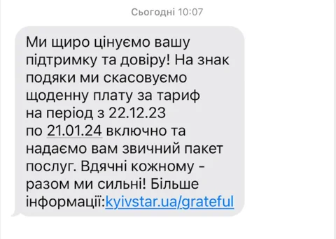 22 декабря абоненты Киевстар начали получать сообщения, в которых говорится о том, что мобильный оператор отменяет ежедневную плату по тарифу на период